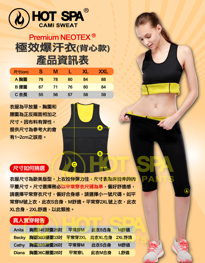 幫助排汗,美肌美體 新一代NEOTEX高科技材質,爆汗效果增高 懶人瘦身運動15分約等於運動燃燒爆汗一小時 收腰剪裁設計,穿上立塑身形 胸前部份採用空氣層材質,透氣不悶熱,全身瘋狂流汗的同時,胸前不會造成大量流汗 針對前腹、後腰、後背均採用NEOTEX智慧織材,虎背熊腰不再來