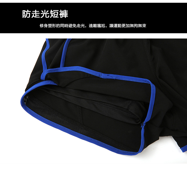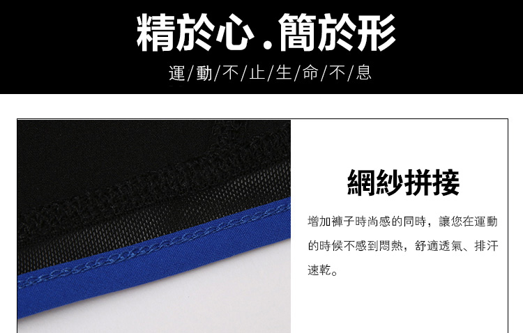 網紗拼接,舒適透氣,排汗速干 撞色包邊設計,遮蓋贅肉,在視覺上更顯瘦 腰頭帶抽繩,不同腰圍的人均可穿著