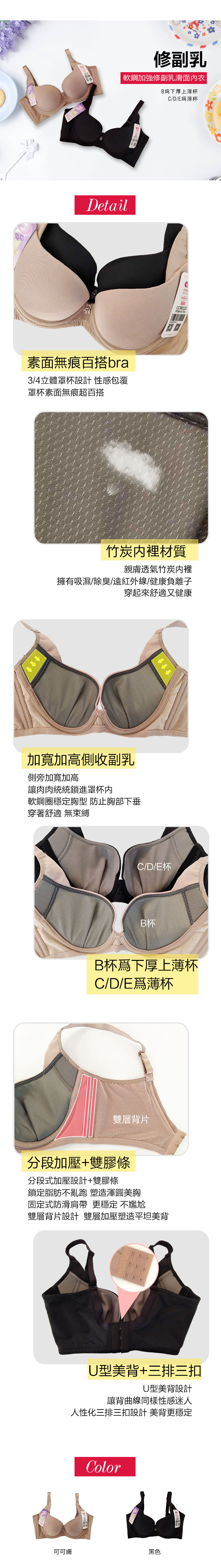 副乳很嚴重嗎?一般的T-恤BRA滿足不了? 穿這件哦!軟鋼加強修副乳滑面內衣 全新設計,比普通的T-恤BRA更呵護你,使用軟鋼圈,穿上後有如沒有穿那樣的舒適,重點是你的副乳都能貼服被鎖住了。 透氣度高,採用吸濕排汗除臭裡層面料,100分的健康。 高機能但無鋼圈感: