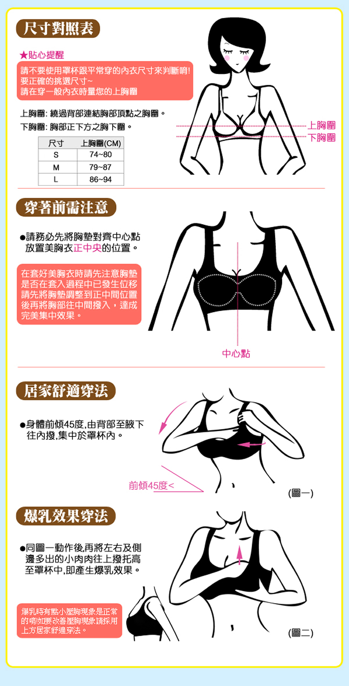 ※適用罩杯尺寸僅供參考,基本上還是建議以上胸圍為挑選美胸衣尺寸的標準唷!