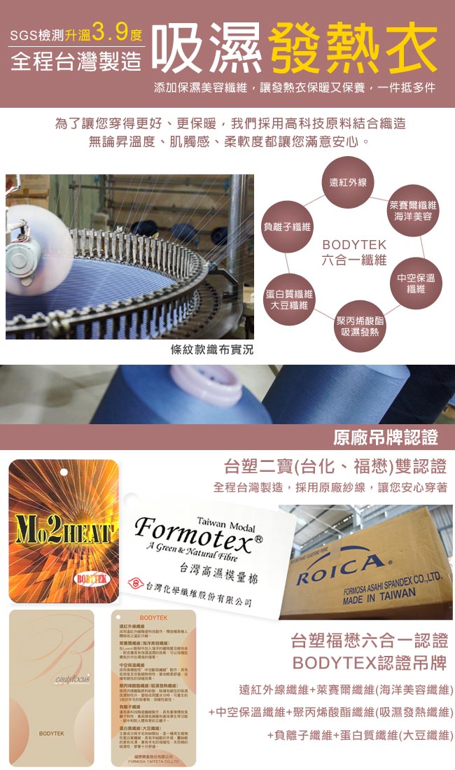 經典百搭色,吸濕保暖發熱衣 立領保暖,舒適袖口設計 採用高科技原料結合織造,柔軟舒適有彈力 台塑福懋六合一認證,BODYTEX認證吊牌