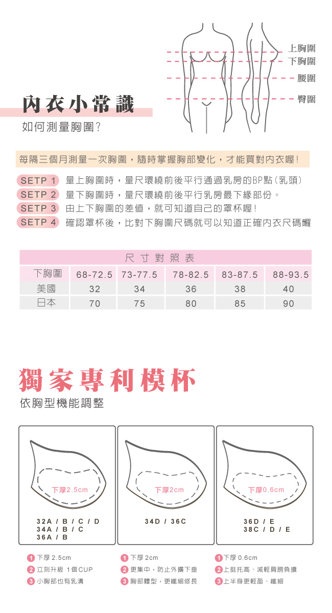 ★本款下厚杯+寬肩帶拉提力強 B罩杯以上加大罩杯選購 ex:32B請選購32C ★本款為成套內衣褲 32 A-C及34 A-C 和 32D 搭配內褲M 34D 和 36 A-D 搭配內褲L 36E 和 38C-E 搭配內褲XL ★內褲尺寸需更換請在訂單備註即可 腰圍M(22-28")/L(29-32")/XL(33-38")