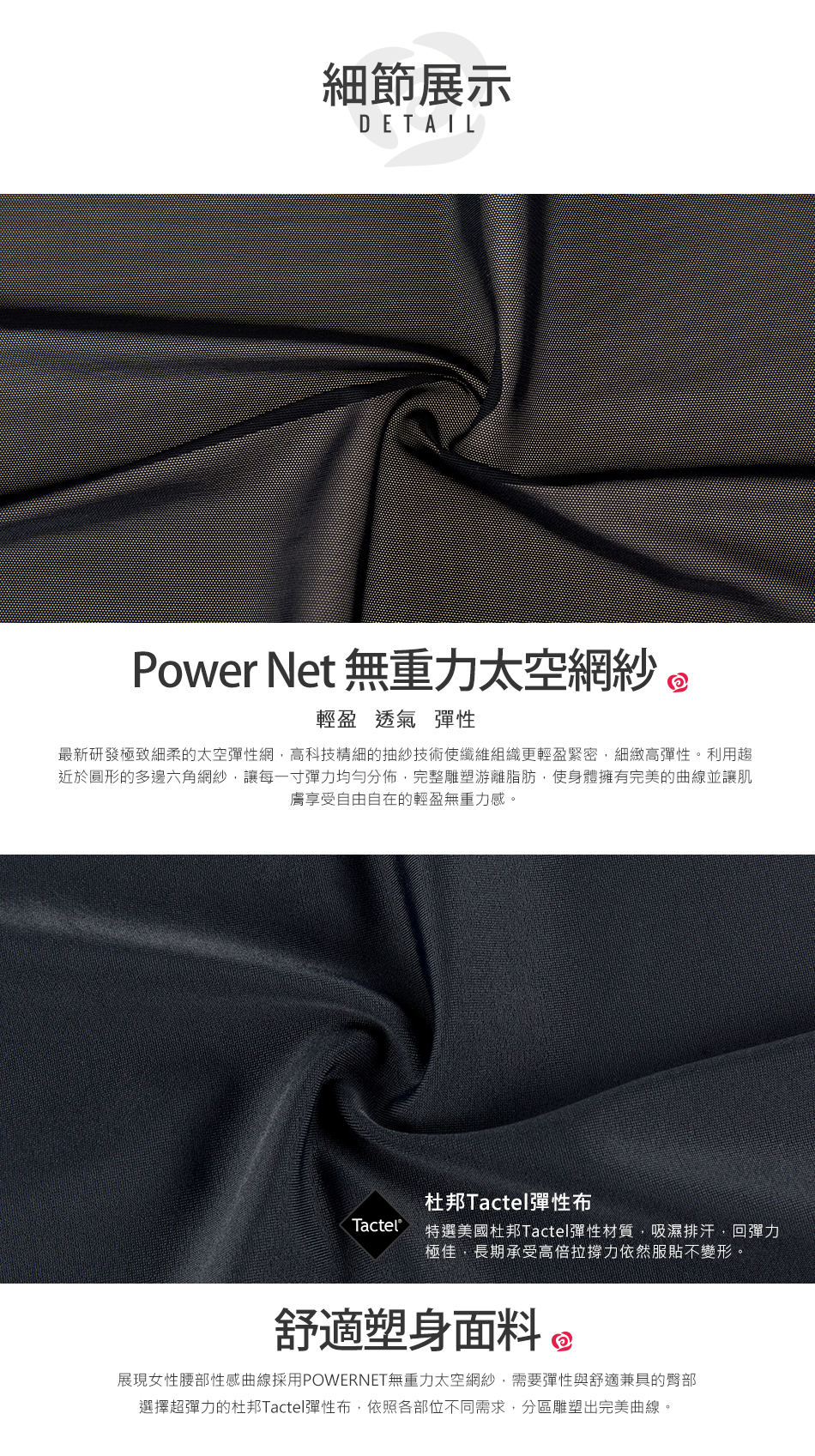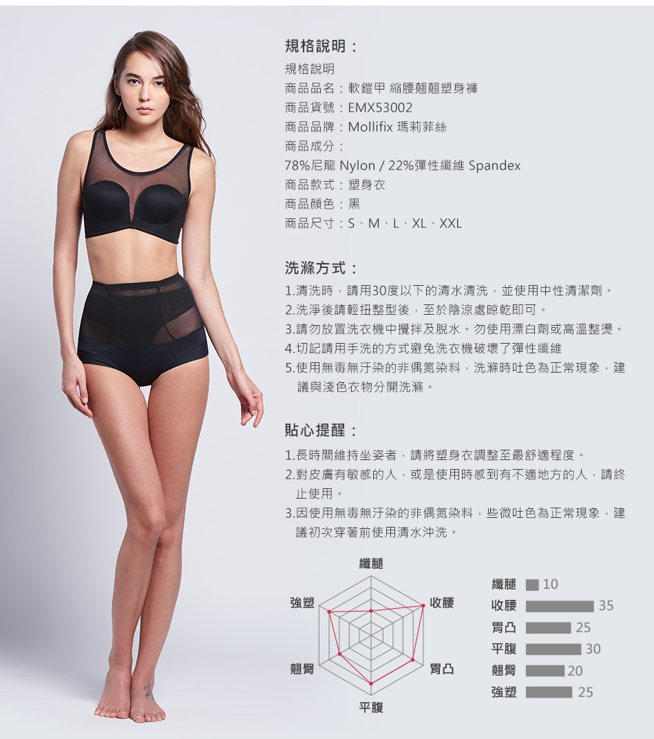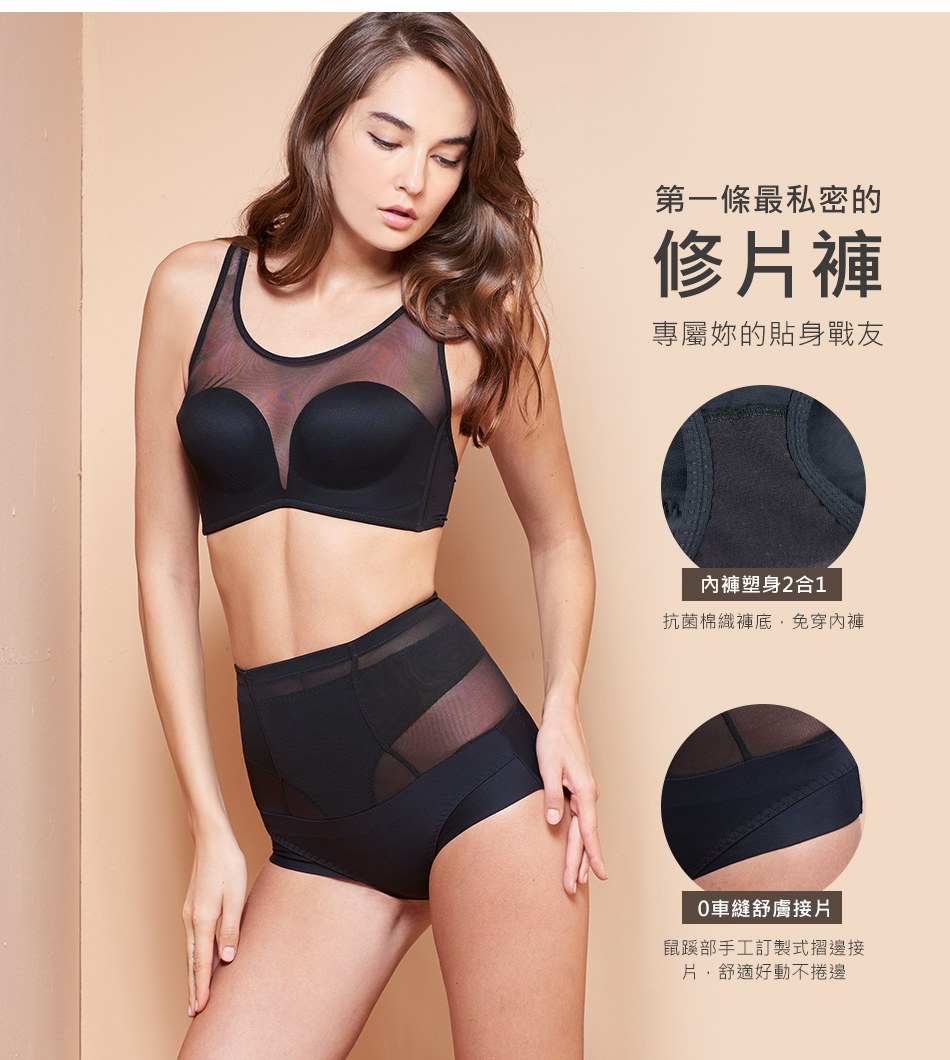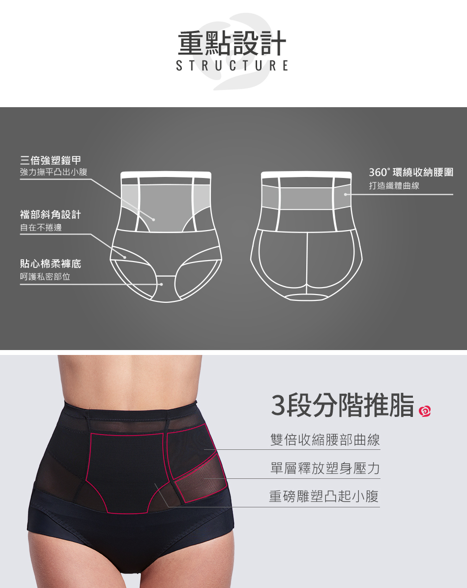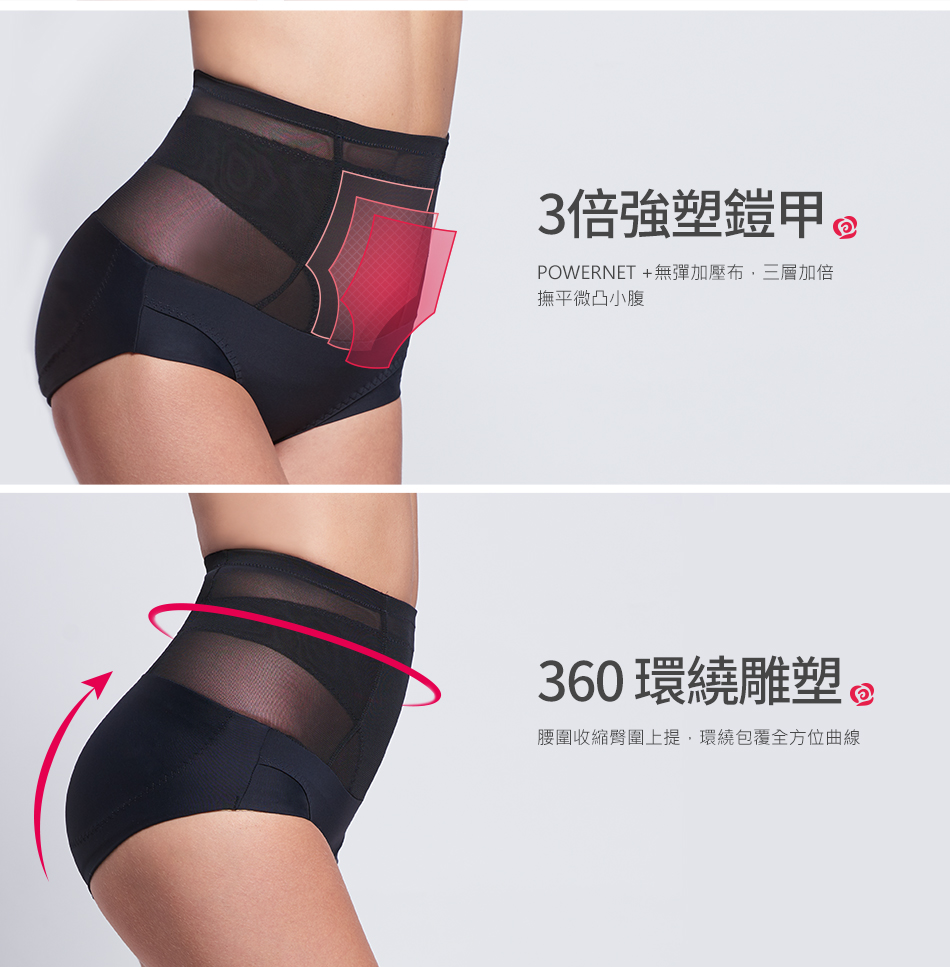 3倍強塑鎧甲、3段分階推脂、360環繞雕塑; PowerNet無重力太空網紗,輕盈、透氣、彈性; 強力撫平凸出小腹,打造織體曲綫; 襠部斜角設計,自在不捲邊; 貼心綿柔褲底,呵護私密部位。