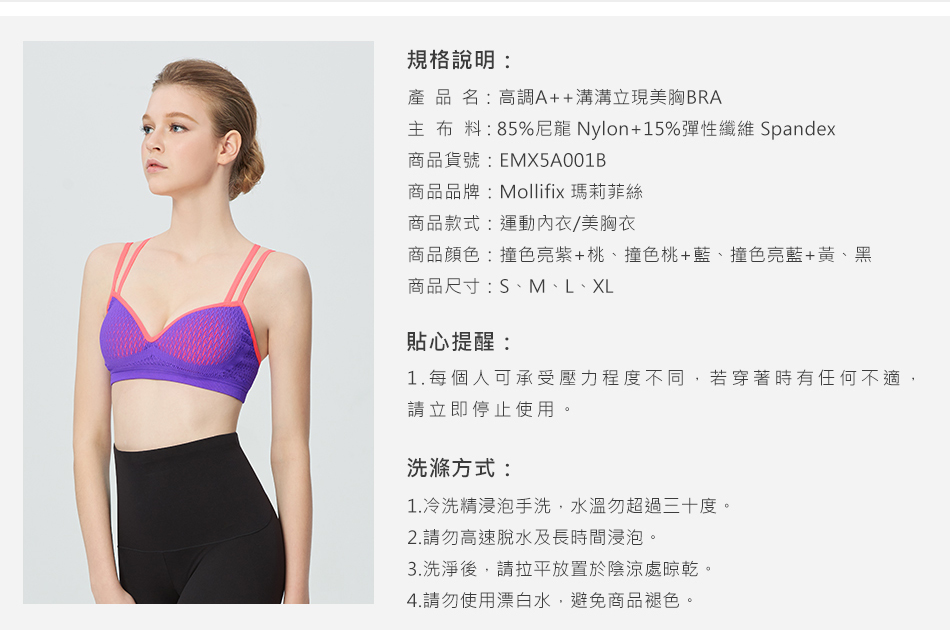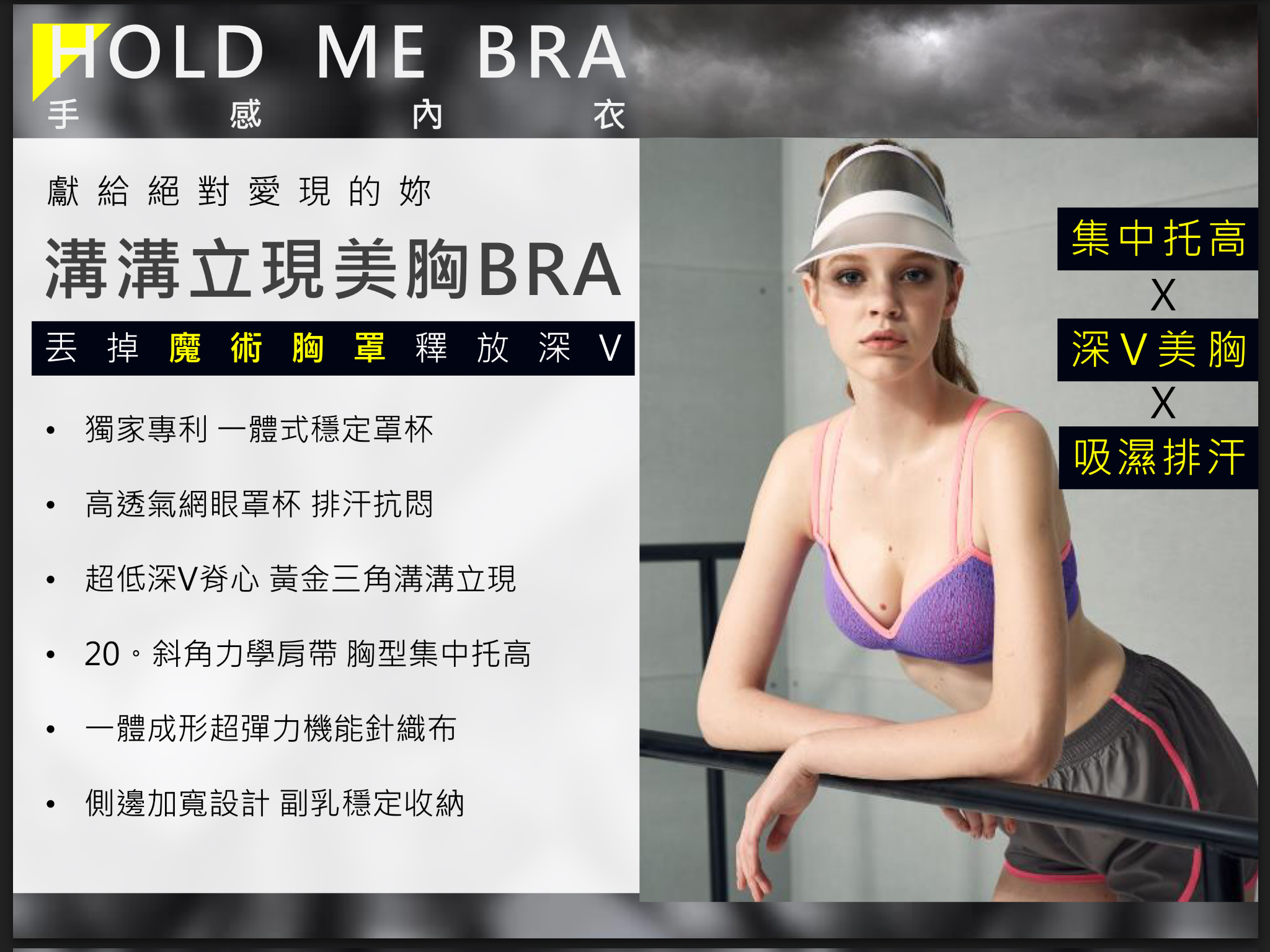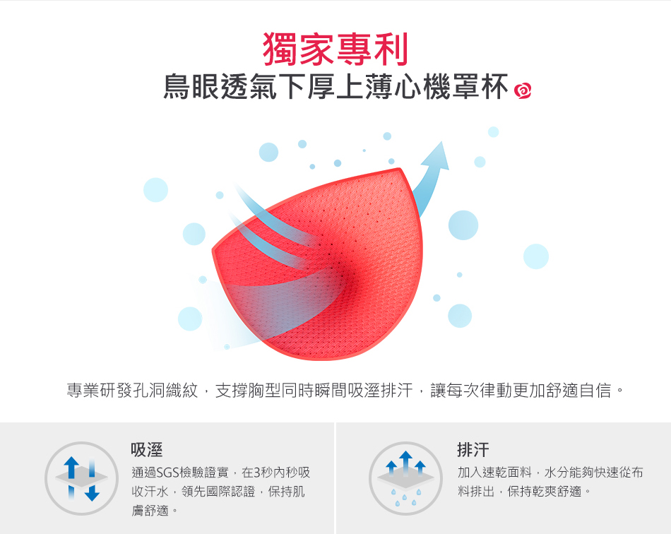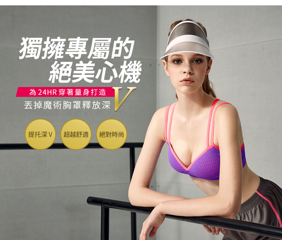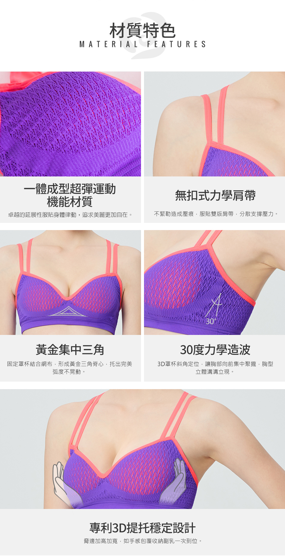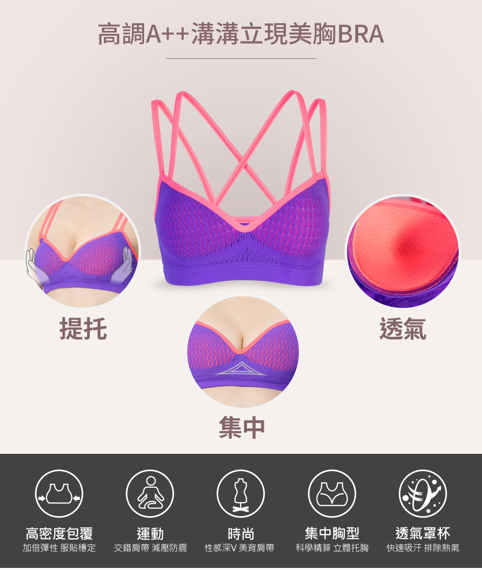 獨家專利 一體式穩定罩杯 高透氣網眼罩杯 排汗抗悶 超低深V脊心 黃金三角溝溝立現 20°斜角力學肩帶 胸型集中托高 一體成型超彈力機能針織布 側邊加寬設計 副乳穩定收納