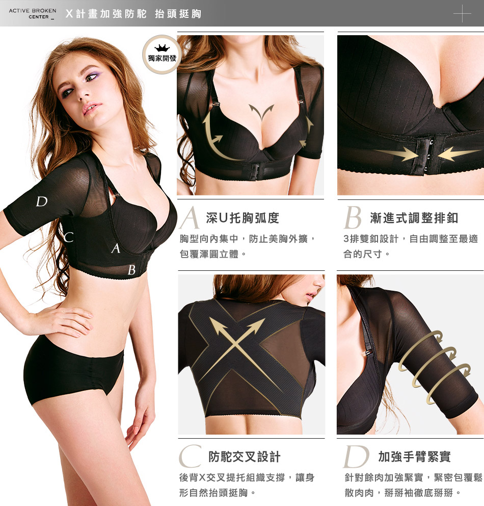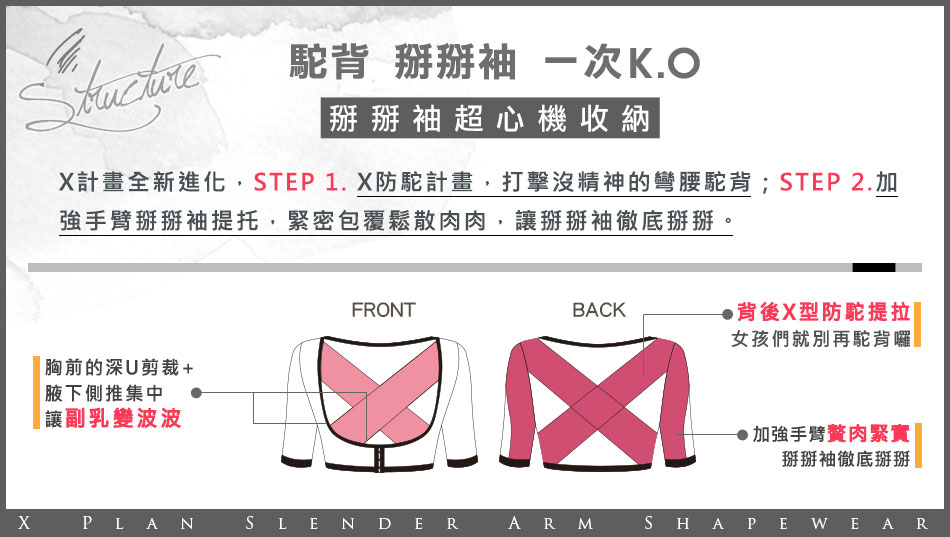 駝背 掰掰袖 一次K.O. X計畫加強防駝 抬頭挺胸 掰掰袖超心機收納 深U托胸弧度 X 防駝交叉設計 X加強手臂緊實 駝背 掰掰袖 一次K.O. X計畫全新進化 STEP 1.X防駝計畫,打擊沒精神的彎腰駝背 STEP 2.加強手臂掰掰袖提托,緊密包覆鬆散肉肉,讓掰掰袖徹底掰掰。